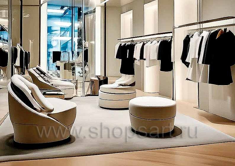 Роскошный дизайн магазина одежды предполагает, помимо прочего, наличие уютных пушистых ковров, а также дорогого текстиля. Стоит отметить, что эти элементы делают интерьер по-настоящему привлекательным.