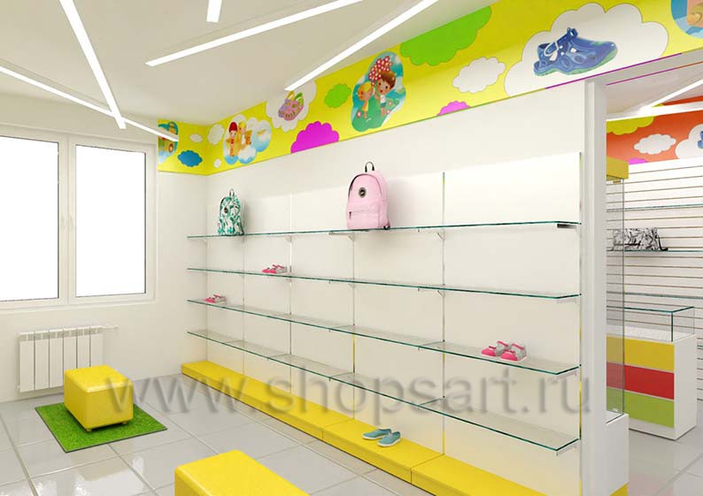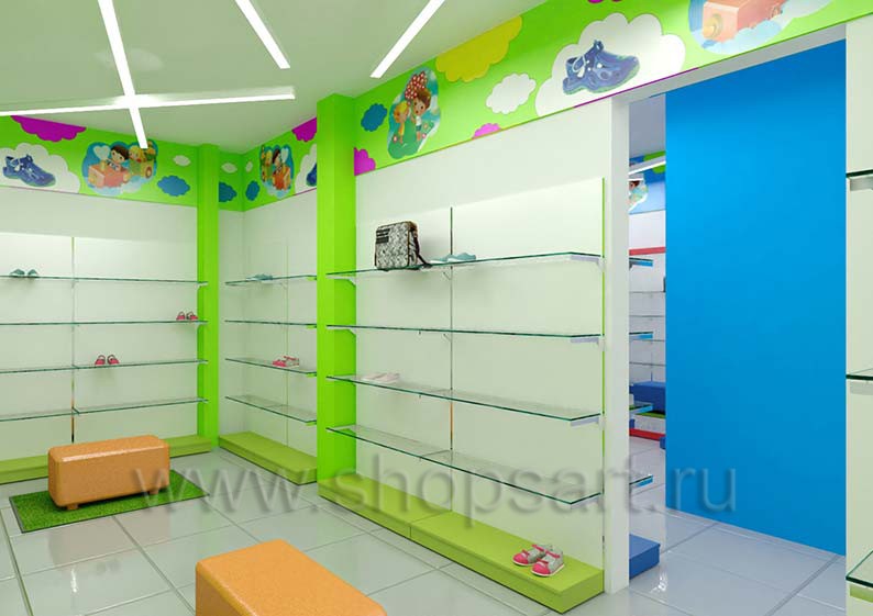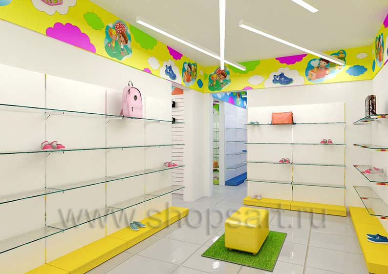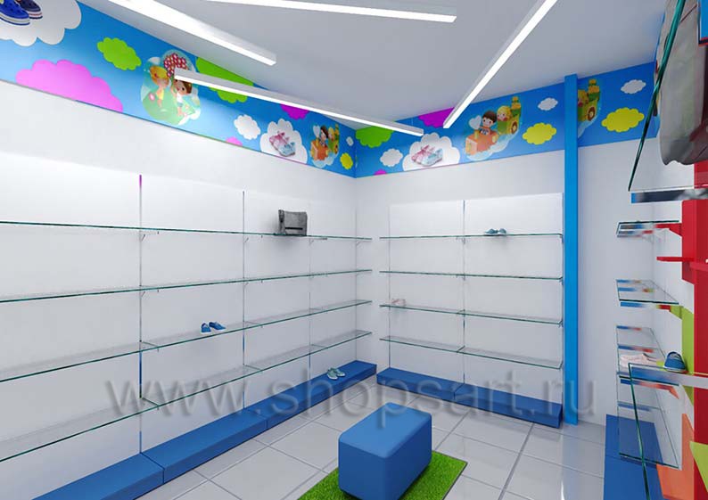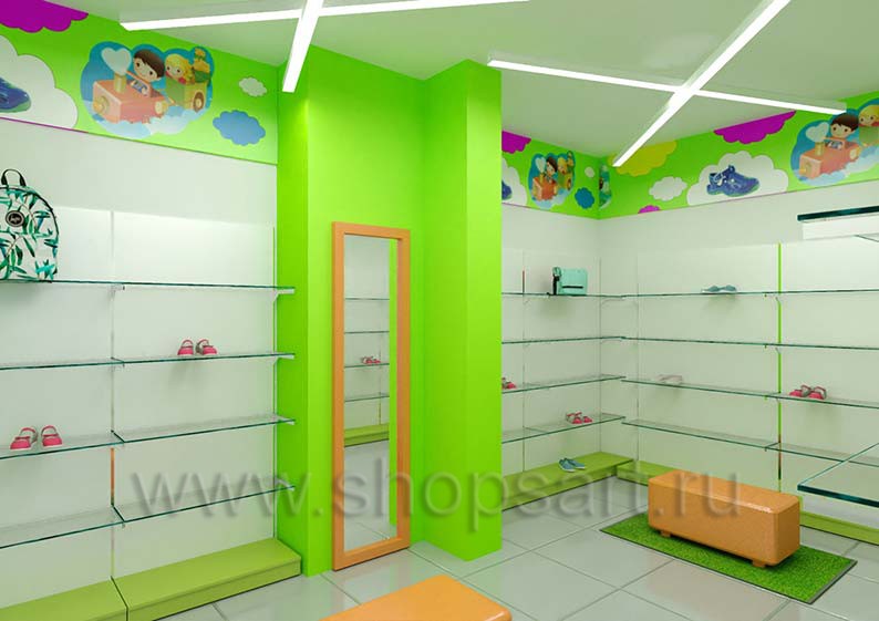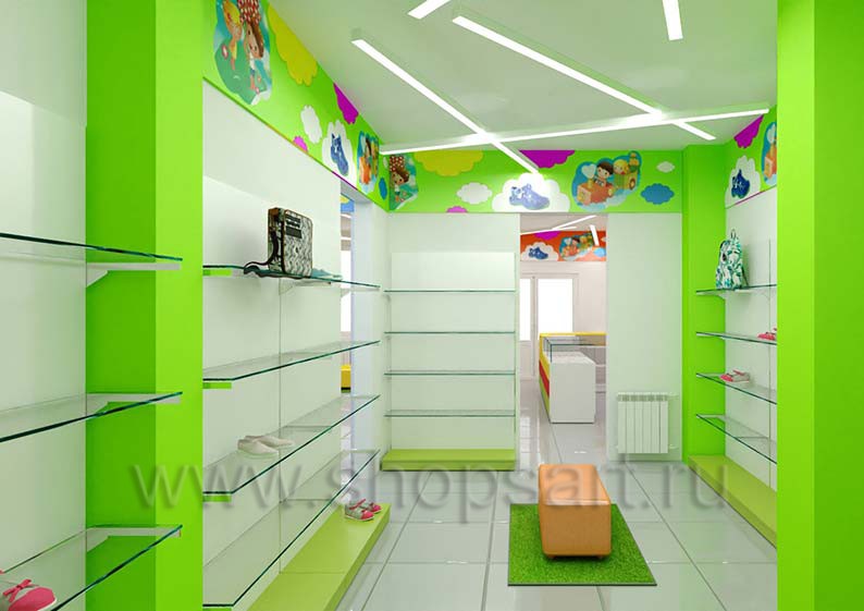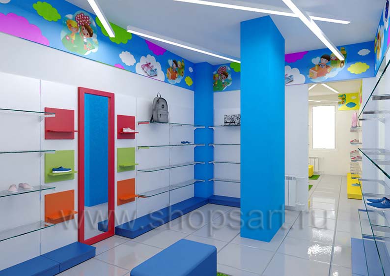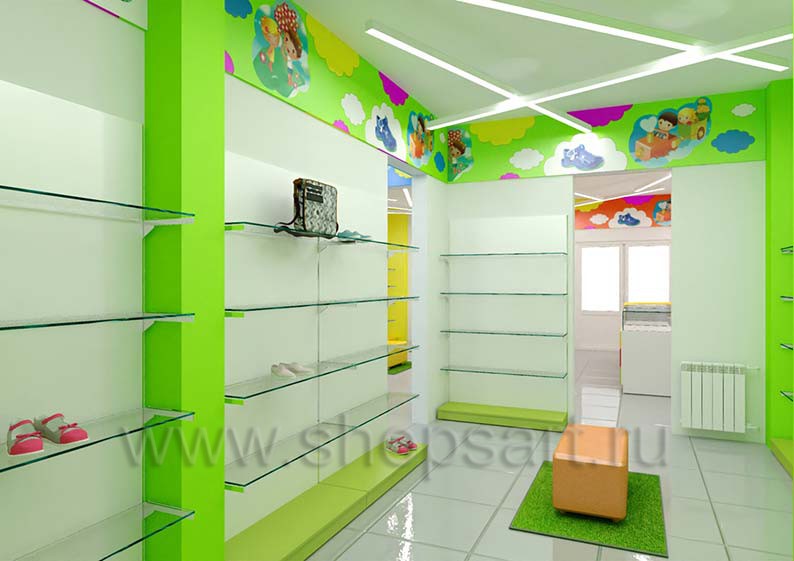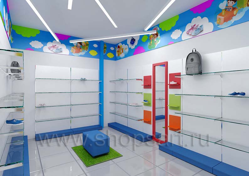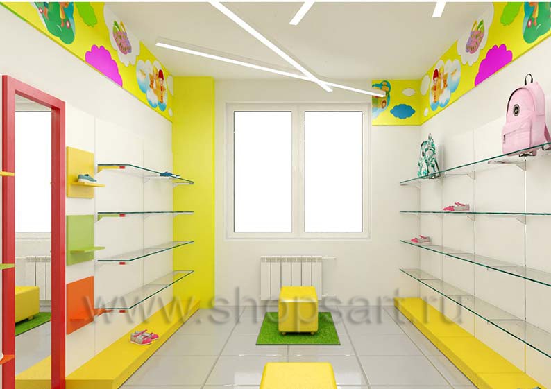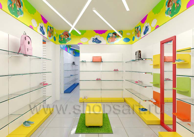 - Чем больше площадь магазина, тем шире возможности для творчества дизайнера. Однако и с точки зрения обеспечения комфорта детям этот критерий обязателен. Дети – резвые создания. Они подвижны, потому им необходимо свободное пространство. Если торговый зал заставлен по всей территории стеллажами, вешалами и островными конструкциями, значительно повышается риск возникновения ушибов и травм у маленьких покупателей. Это недопустимо! Поэтому следует обеспечить просторную свободную площадь на пути маршрута посетителей. Торговое оборудование не должно содержать острых углов и элементов из хрупкого стекла. Также нельзя использовать конструкции, изготовленные из материалов, выделяющих токсические испарения. Это вредно для детского организма.