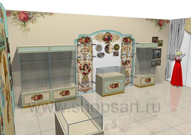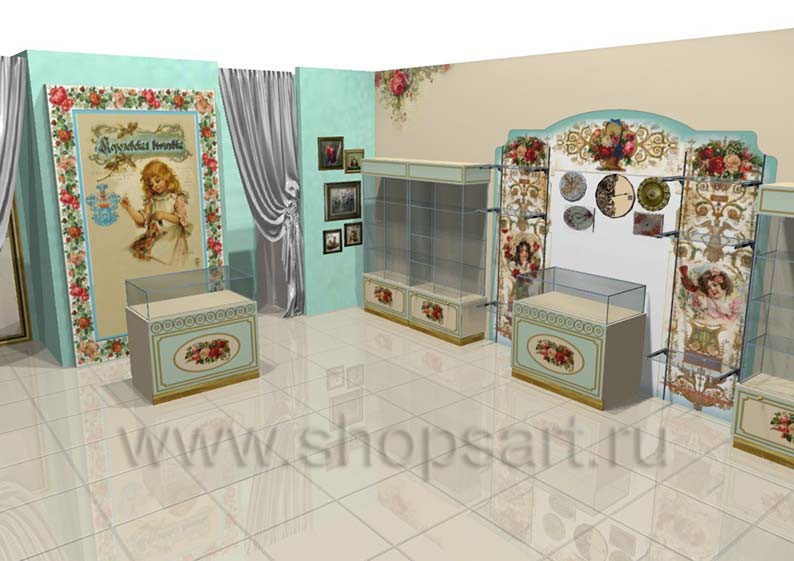 Коллекция «Винтаж» идеально подойдет для создания нежной атмосферы в торговом зале. Конструкции пастельных тонов с цветочным расписным декором смотрятся изящно и слегка сказочно. Для отделки цоколя применяется металлизированный пластик золотистого оттенка.