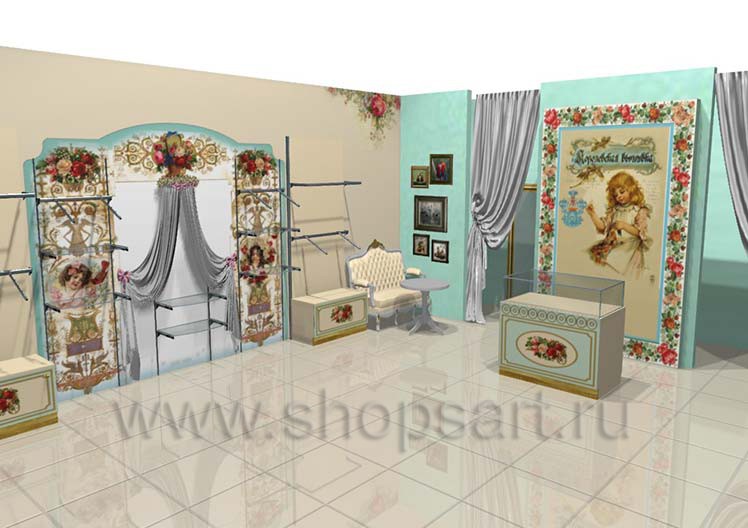 На этой странице Вы можете ознакомиться с дизайном интерьера детского магазина «Королевская вышивка», находящегося в городе Сочи, на основе коллекции торгового оборудования «ВИНТАЖ». Разработала дизайн магазина и дизайн торговой мебели компания «Искусство интерьеров». Узнать больше о наших коллекциях оборудования для детских магазинов Вы можете на странице торгового оборудования для детских магазинов.