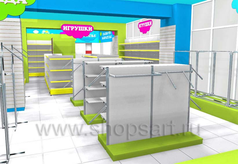 Торговое оборудование для детских магазинов на основе коллекции ЦВЕТНЫЕ МЕТАЛЛИЧЕСКИЕ СТЕЛЛАЖИ