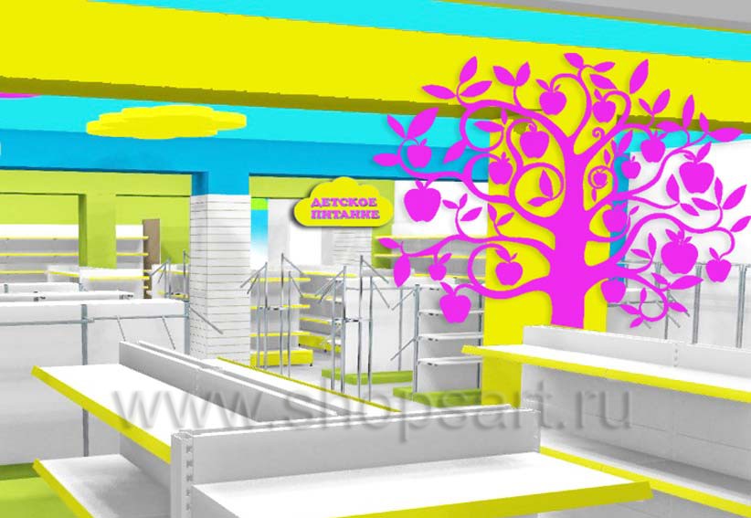 Интерьер магазина – это, по сути, его лицо, его визитная карточка. Оригинальная торговая мебель и привлекательный дизайн коммерческого объекта повышают его узнаваемость и привлекают новых клиентов. А красиво оформленные стены с мотивами из детских сказок не останутся незамеченными маленькими покупателями.