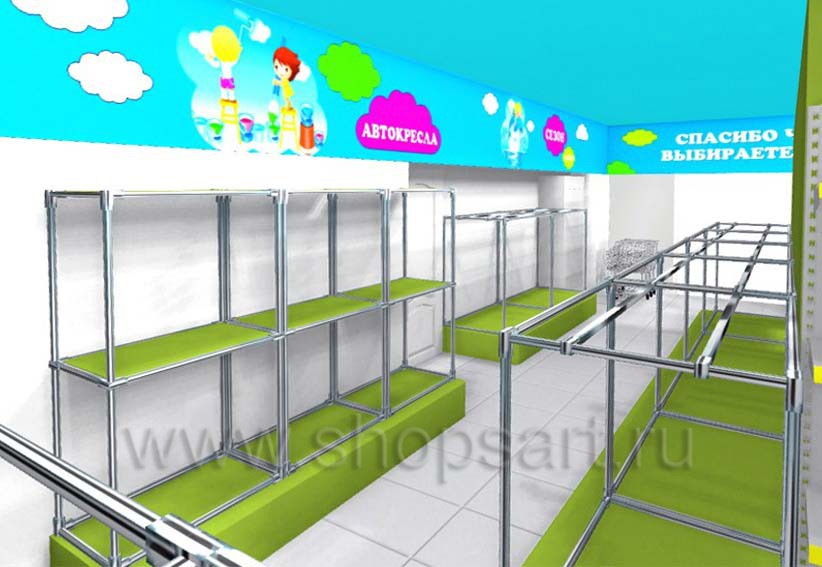 Фотографии торгового оборудования в открытых детских магазинах на основе коллекции ЦВЕТНЫЕ МЕТАЛЛИЧЕСКИЕ СТЕЛЛАЖИ