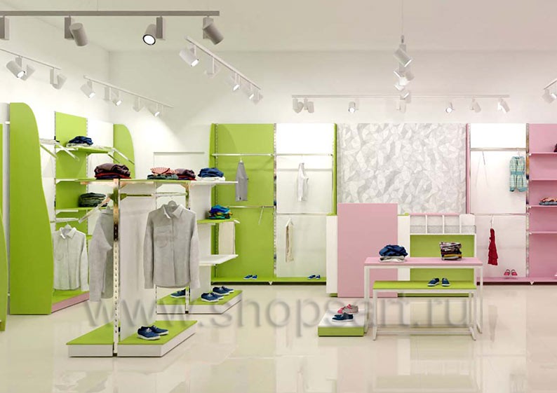 Как выполняется зонирование? Для разделения территории торгового зала на функциональные зоны можно использовать разные цвета. Это самый распространенный прием зонирования. Стены отделов с товарами для мальчиков традиционно окрашивают в голубой цвет, а стены с продукцией для девочек – в розовый. Однако можно смело применять и другие цветовые вариации, например, салатовый и ярко-желтый. Интересное оформление представляет собой дизайн интерьера детского магазина на основе торгового оборудования Розовая фантазия. Следует отметить, что зонирование с использованием цветового разделения пространства является наименее затратным.