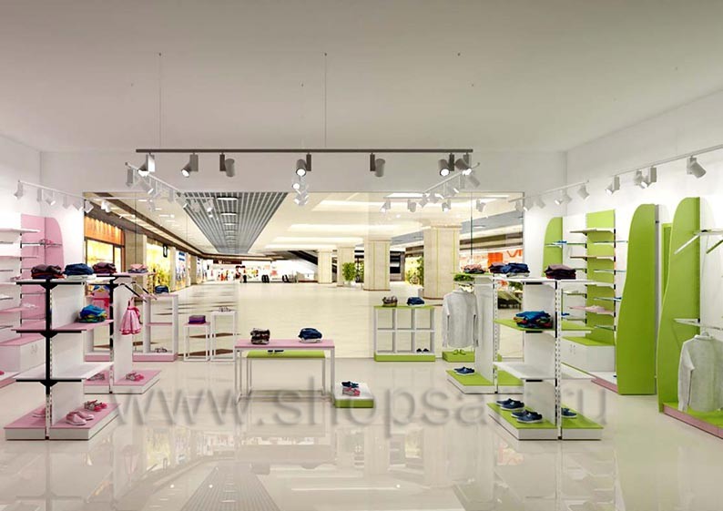 Фотографии торгового оборудования в открытом детском магазине “Бэби Бум”, г. Москва район Марьино, на основе коллекции «РОЗОВАЯ ФАНТАЗИЯ»
