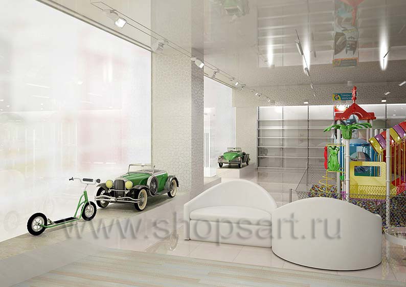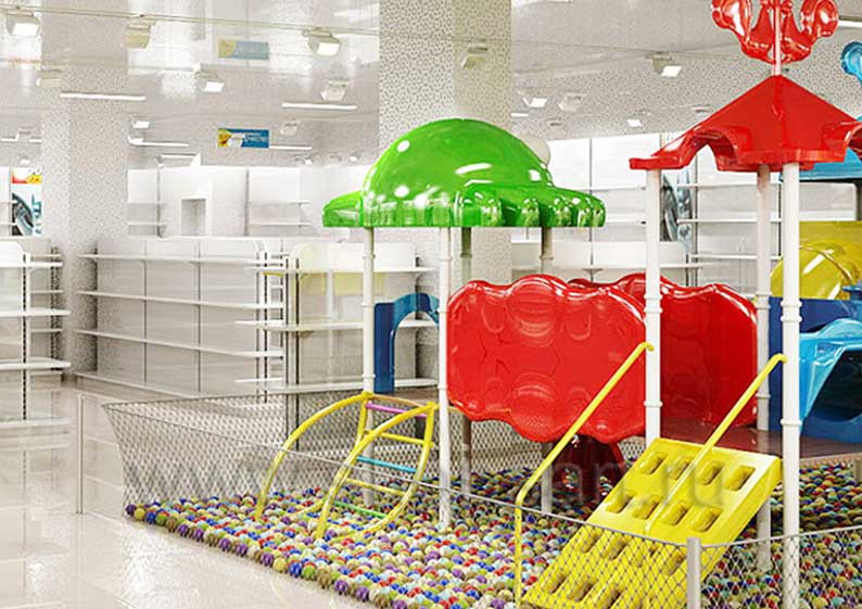 Дети неравнодушны как к любимым мультфильмам и сказкам, так и к играм. Как известно, пора детства ассоциируется именно с игровой деятельностью. Можно использовать эту детскую слабость во благо вашего бизнеса ну и, конечно, в удовольствие для маленьких посетителей. Игровая площадка будет вполне уместна в магазине игрушек. Особенно актуален такой дизайн, если в продаже имеются детские спортивные товары, к примеру, мячи и т.д.