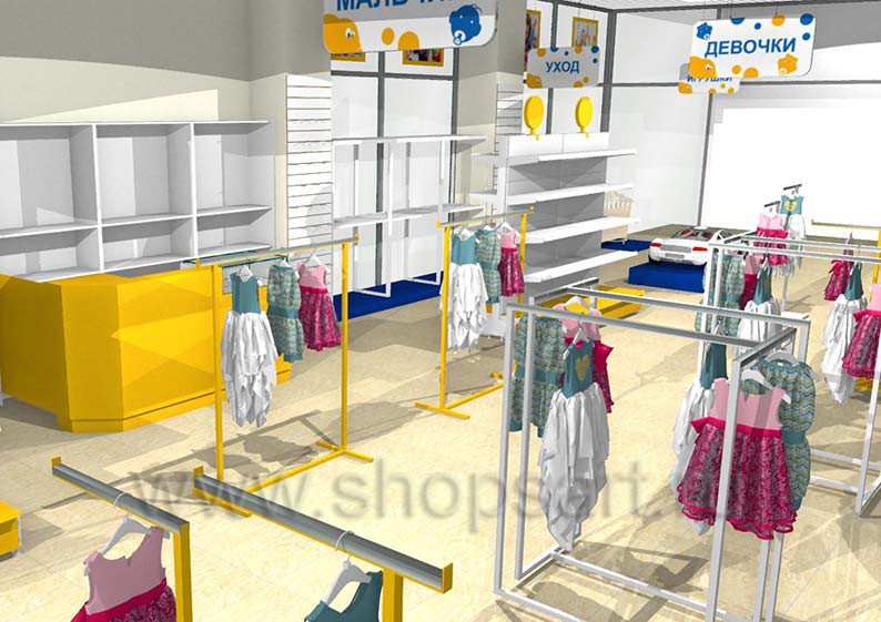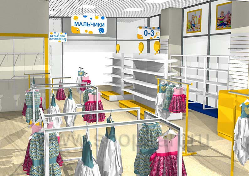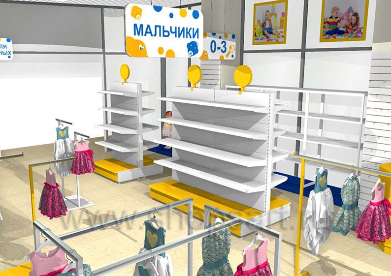Дизайн-проект детского магазина “ЁМАЁ” г. Хабаровск, ТЦ “Броско Молл”, на основе коллекции торгового оборудования “РАДУГА”