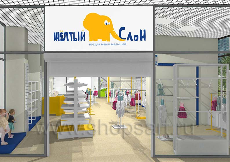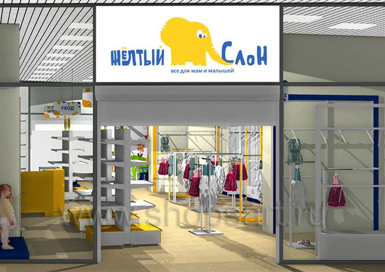 Дизайн-проект детского магазина “Жёлтый слон” г. Сургут, ТЦ “Браво”, на основе коллекции торгового оборудования “РАДУГА”