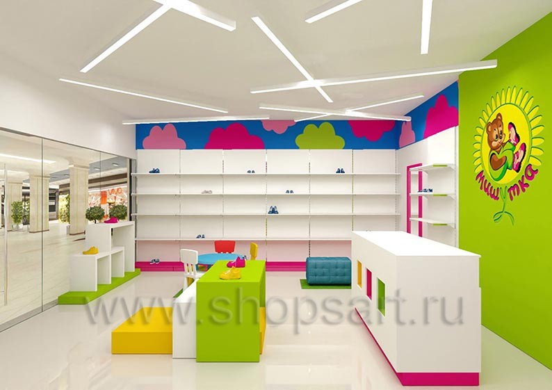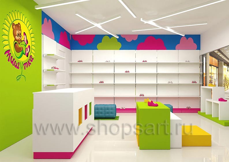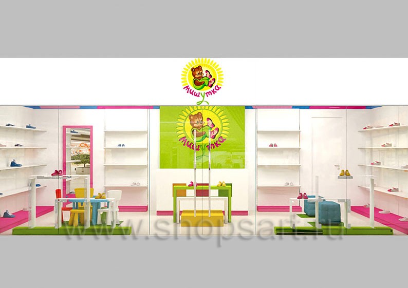 Меблировка торгового заведения, реализующего обувь для детей, включает в себя: