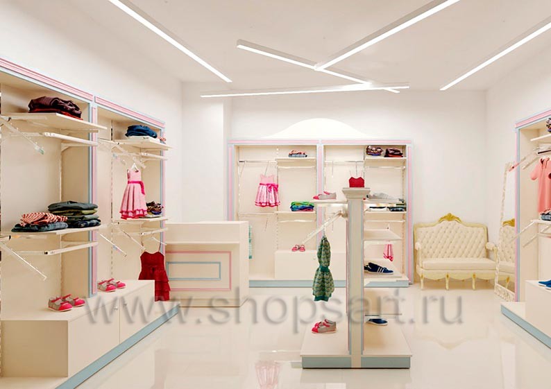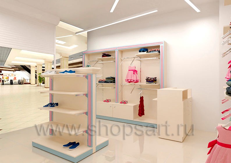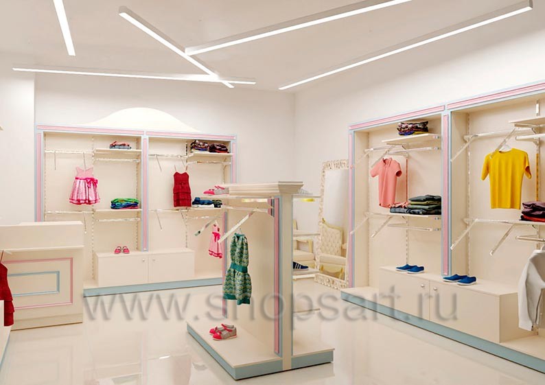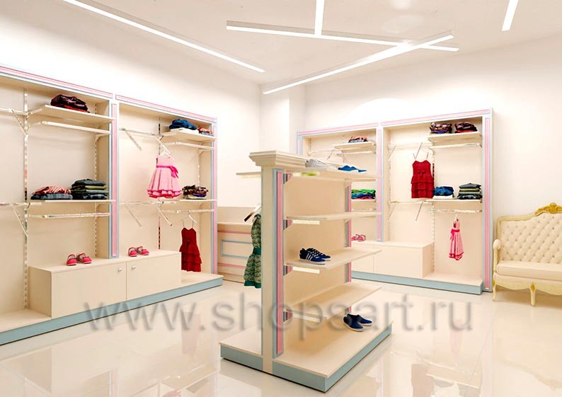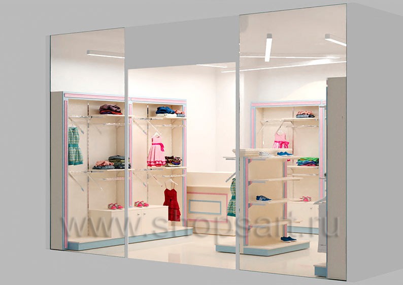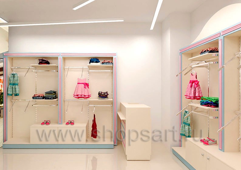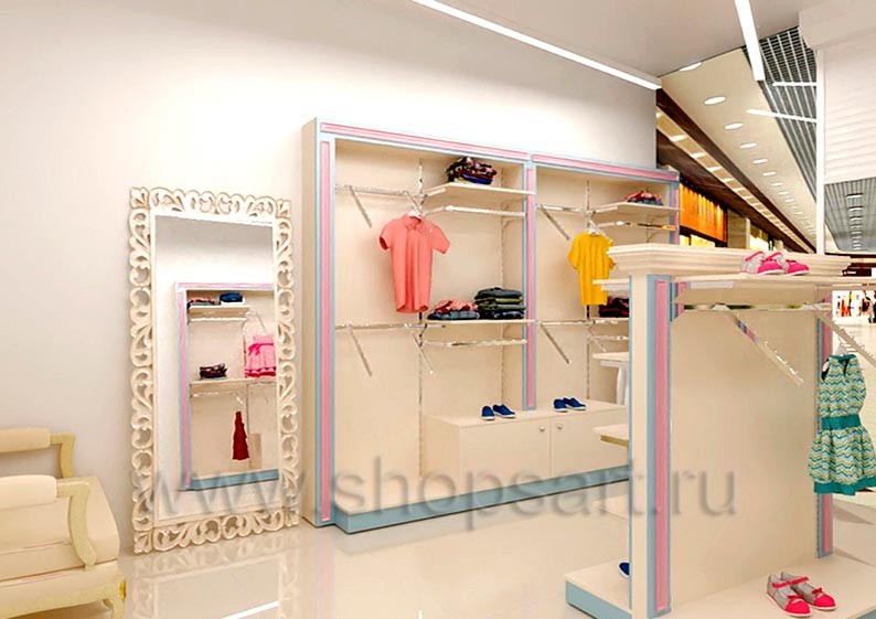 - Дизайн детского магазина одежды предполагает грамотную выкладку и развешивание изделий. Для выполнения этой задачи понадобится соответствующее торговое оборудование.