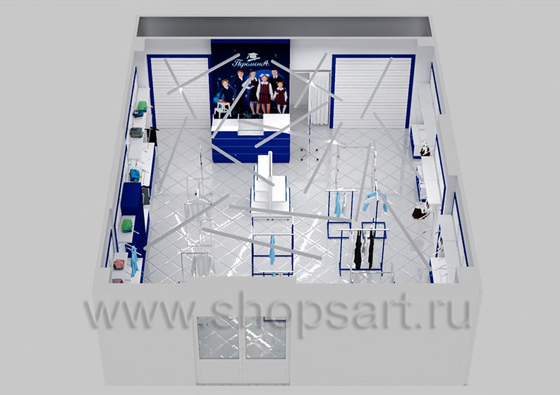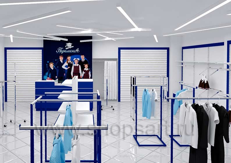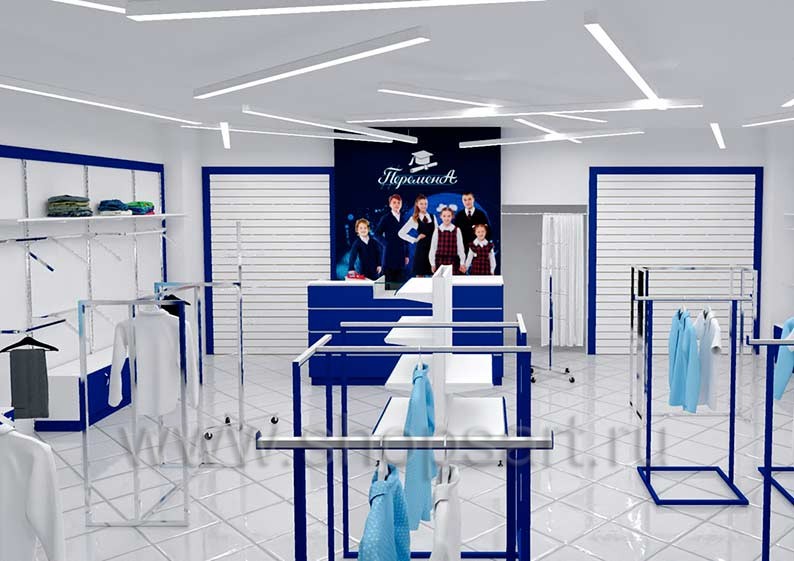 На этой странице Вы можете ознакомиться с дизайном интерьера и дизайном торговой мебели магазина детской одежды и школьной формы “Перемена”, находящегося в ТРЦ «Азовский» г. Москва, ул. Азовская, дом 25, корпус 3, на основе коллекции торгового оборудования «ГОЛУБАЯ ЛАГУНА». Разработала дизайн магазина одежды и дизайн торговой мебели компания ООО «Искусство интерьеров». Узнать больше о наших коллекциях оборудования для одежды Вы можете на странице торговой мебели для магазинов одежды.
