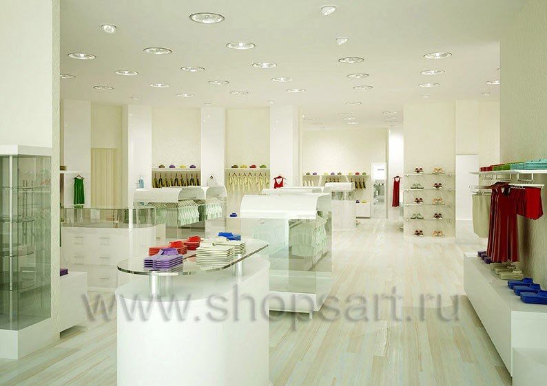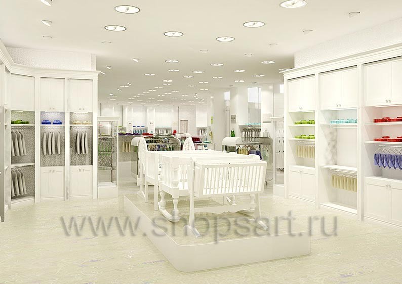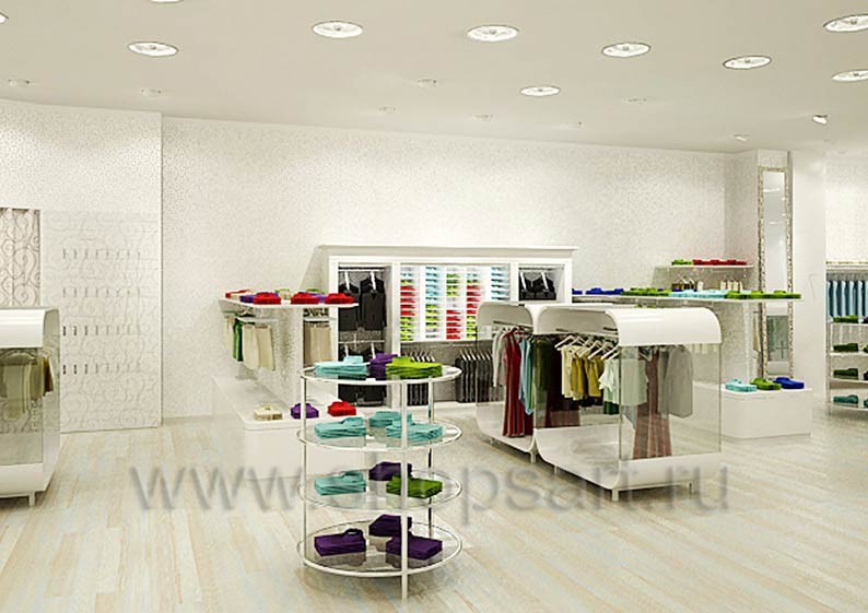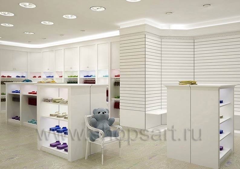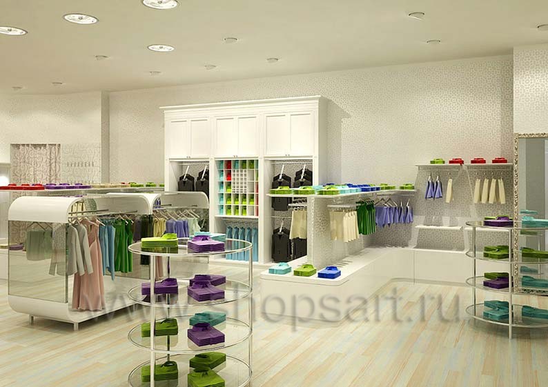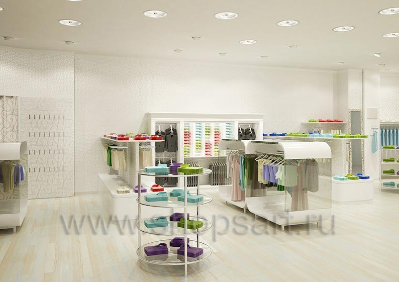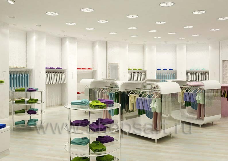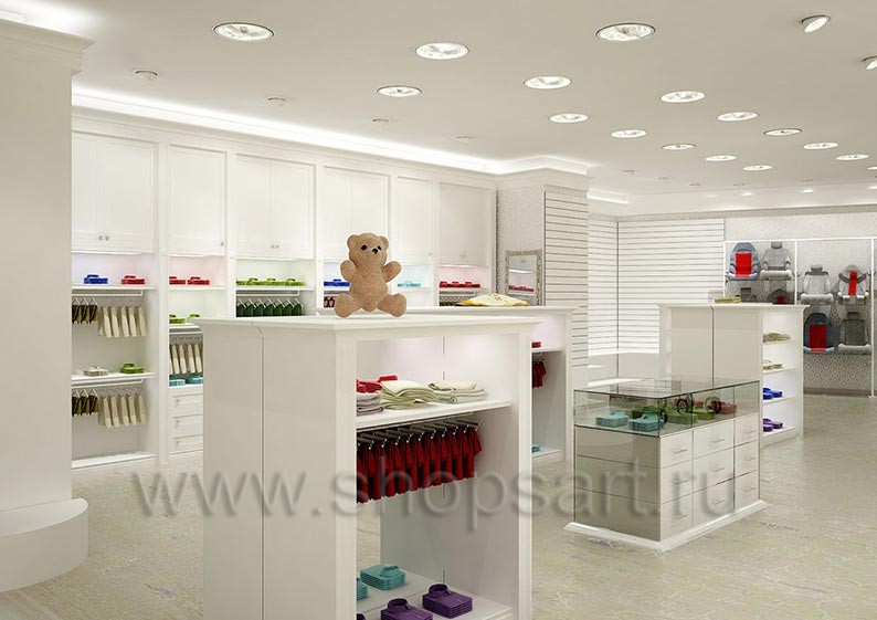 - Акцентировать внимание покупателей на представленной в магазине одежде. Когда торговая мебель оснащена подсветкой, размещенные на ней изделия смотрятся выигрышно и очень привлекательно. Такое оборудование для одежды обеспечит эффектную демонстрацию товаров, что немаловажно для развития бизнеса. Специалисты считают, что освещенность торговых конструкций должна быть ярче общего света в коммерческом помещении примерно на 30-40%. Если дизайн магазина детской одежды выполняют профессионалы, то они непременно учтут этот нюанс.