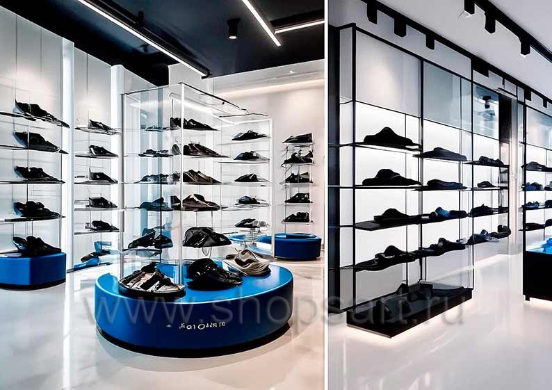 Фотографии торгового оборудования в открытых магазинах обуви на основе коллекции СТИЛЬ ЛОФТ