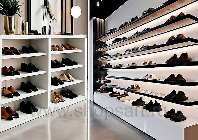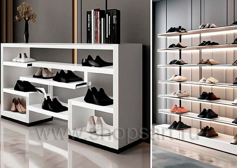Функциональное оснащение является ключевой фигурой в оформлении заведения, реализующего обувь. В частности, для демонстрации такого товара применяются конструкции следующих типов: