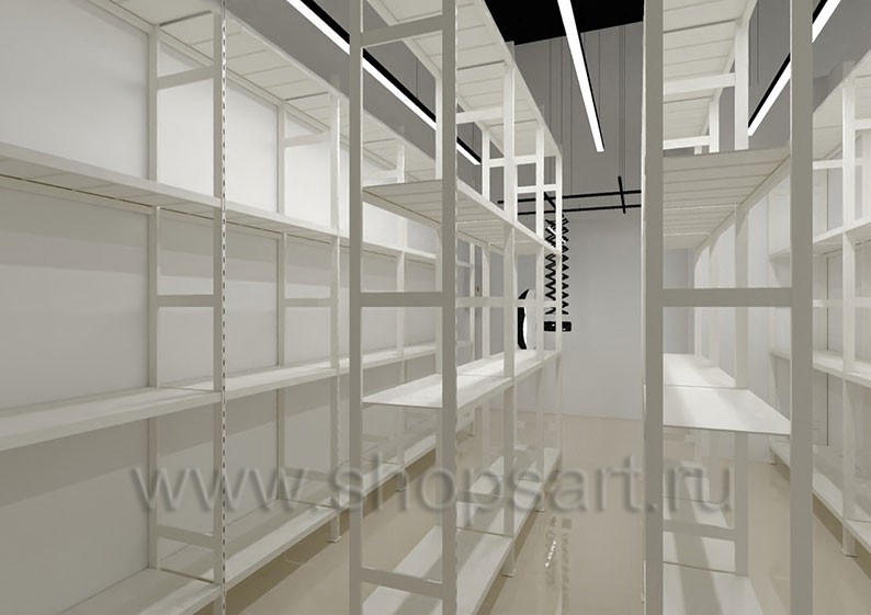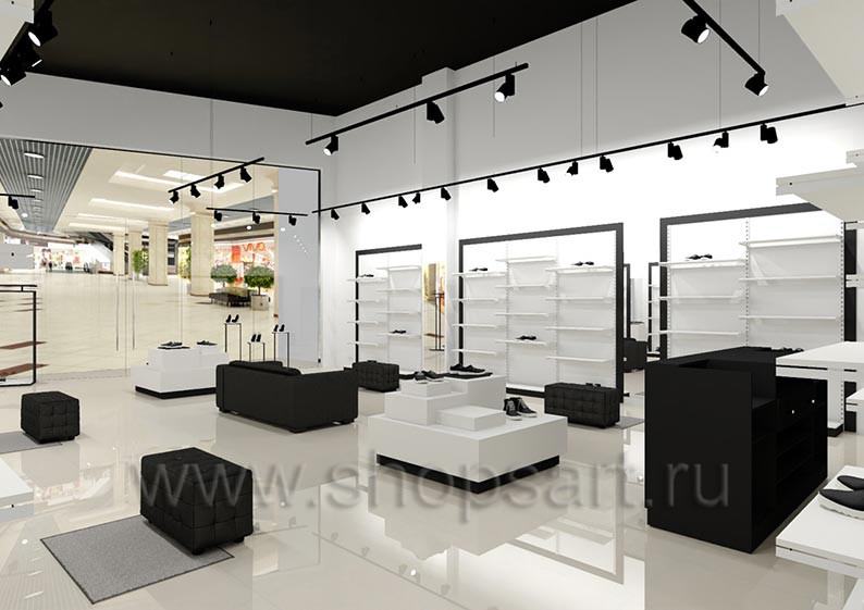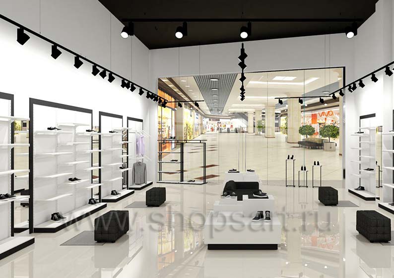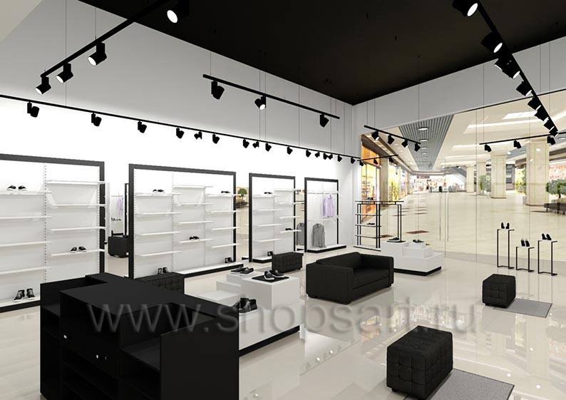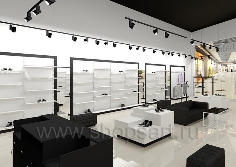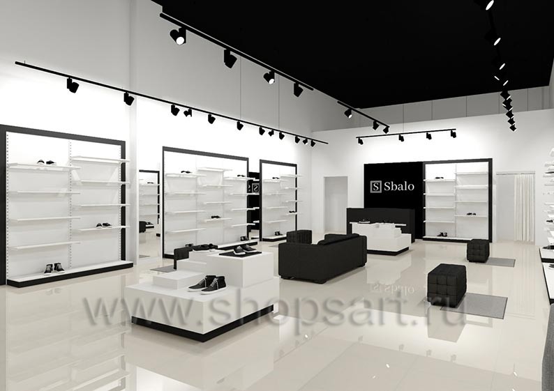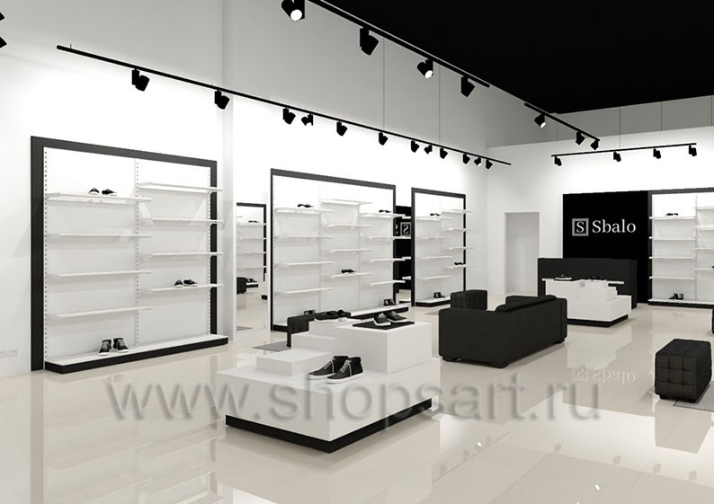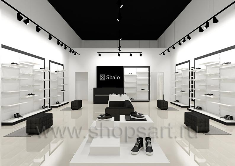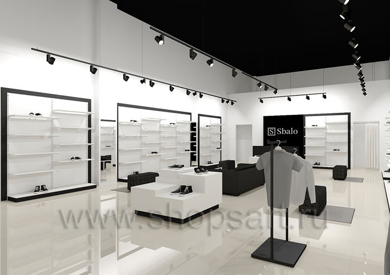 Дизайн-проект магазина одежды и обуви «Sbalo» г. Москва, ТРК Европолис на основе торгового оборудования “ЧЁРНО-БЕЛАЯ КЛАССИКА”