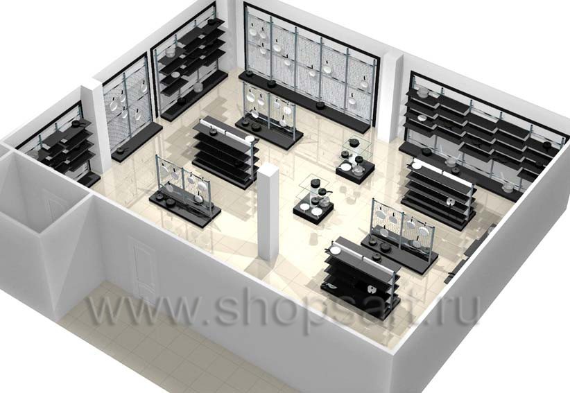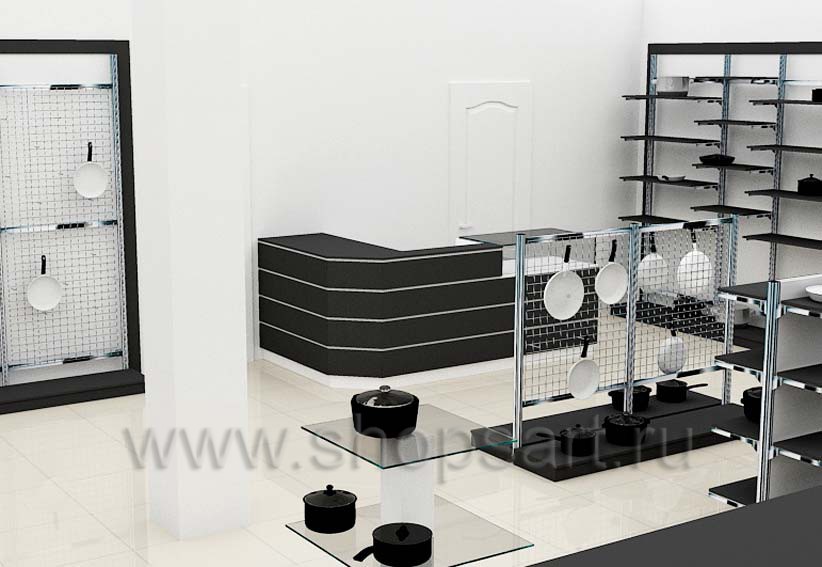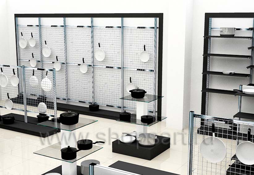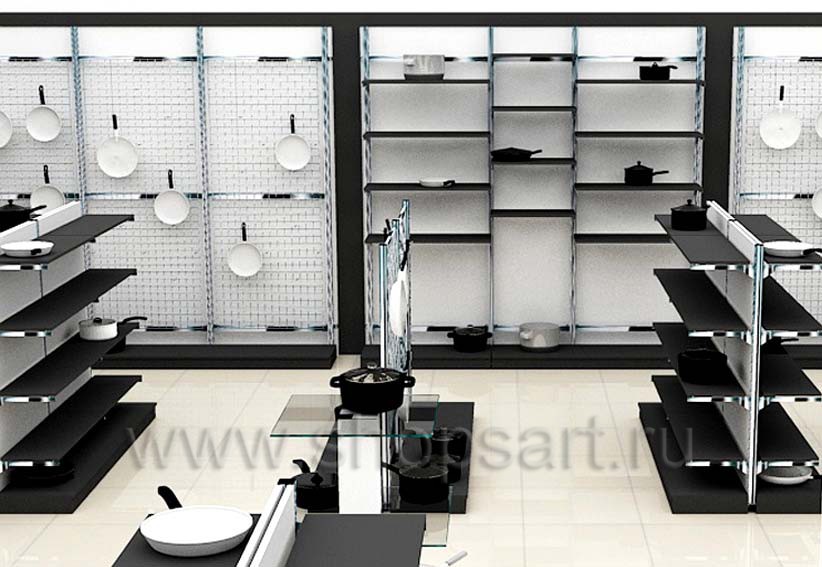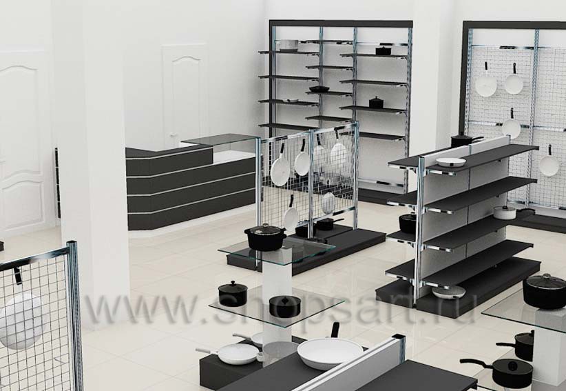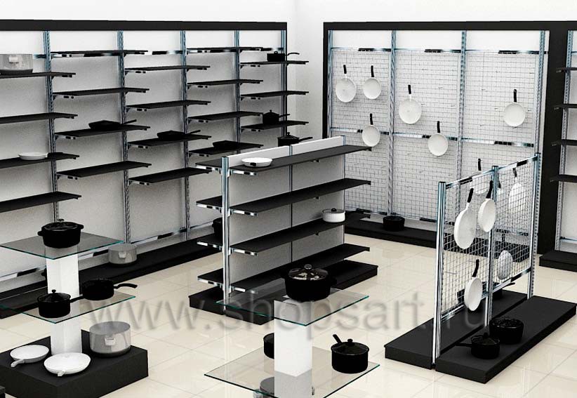 Торговые стеллажи используются для размещения и презентации наиболее ходовых изделий. Витрины применяют для демонстрации дорогой посуды. Прилавки удобны для размещения столовых приборов.