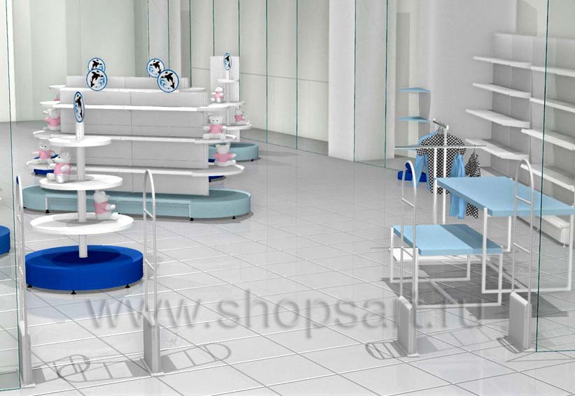 Фотографии торгового оборудования открытого магазина детских товаров в ЖК “Green park”, г. Москва, на основе коллекции «ЦВЕТНЫЕ МЕТАЛЛИЧЕСКИЕ СТЕЛЛАЖИ»