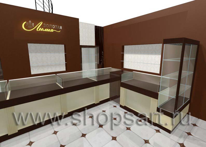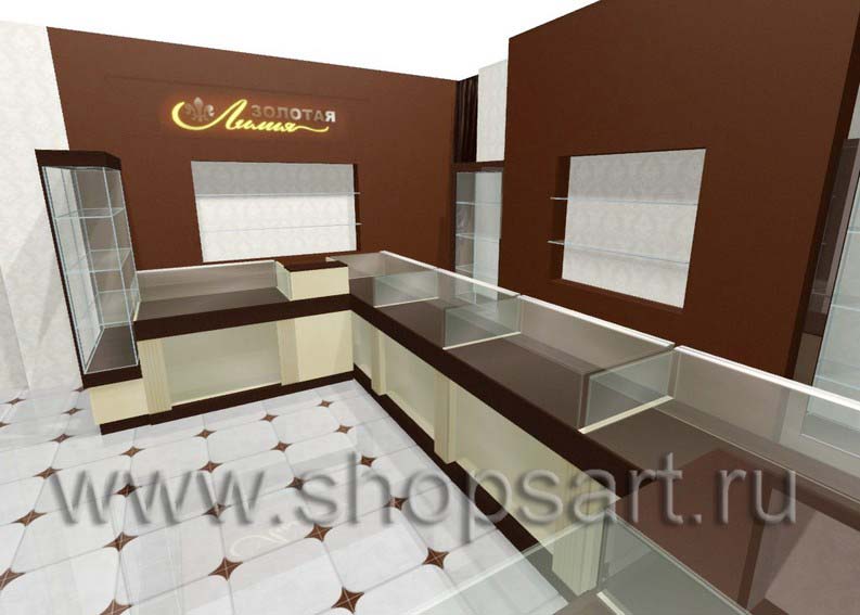 - Дизайн интерьера ювелирного магазина “Золотая Лилия”, г. Москва, на основе коллекции торгового оборудования «ЭТАЛОН». Дизайн 1.