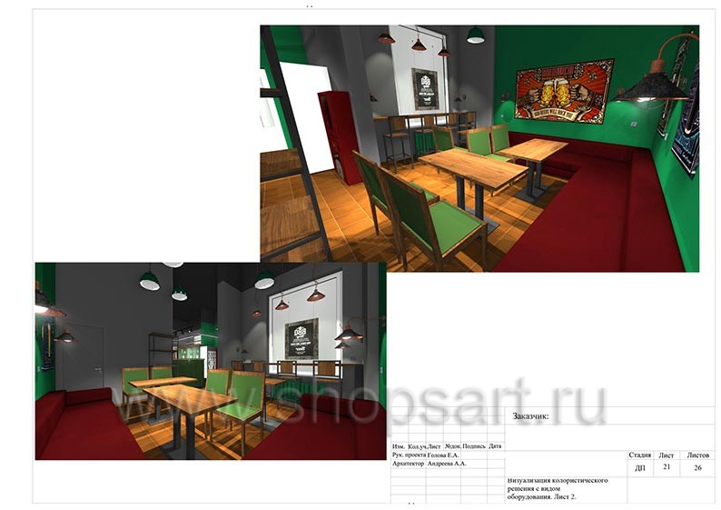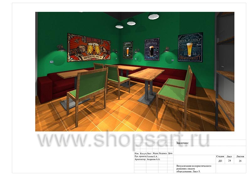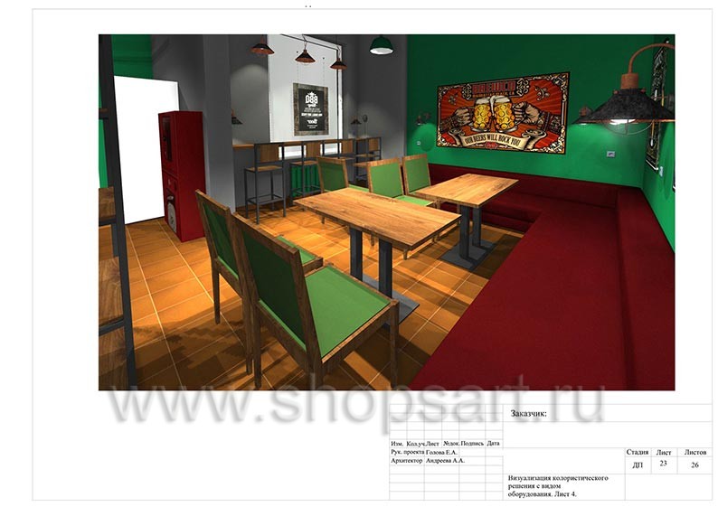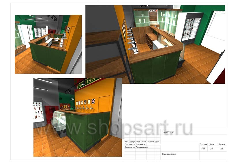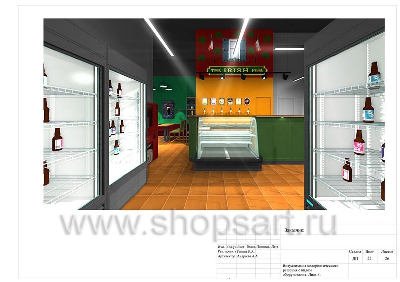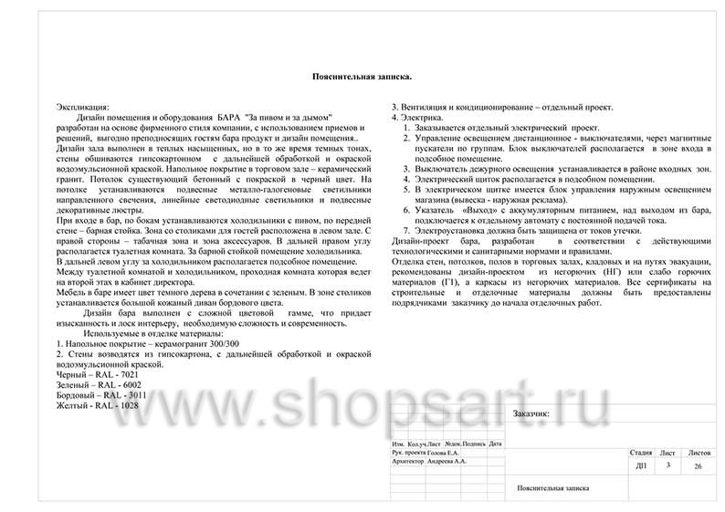 При входе в бар, по бокам, устанавливаются холодильники с пивом, по передней стене – барная стойка. Зона со столиками для гостей расположена слева. С правой стороны табачная зона и зона аксессуаров. В дальнем, правом углу располагается туалетная комната. За барной стойкой – помещение холодильника. В дальнем левом углу, за холодильником, располагается подсобное помещение. Между туалетной комнатой и холодильником запроектирована проходная комната, которая ведет на второй этаж в кабинет директора.