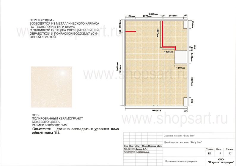 2. Стены изготавливаются из металлического каркаса по технологии “ТИГИ КНАУФ”, с дальнейшей обработкой и окраской водоэмульсионной краской – светло-бежевого цвета.