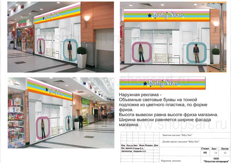 Дизайн помещения магазина «Baby Star», разработан на основе выбранного стиля компании, с использованием приемов и решений, выгодно преподносящих покупателю детскую одежду.