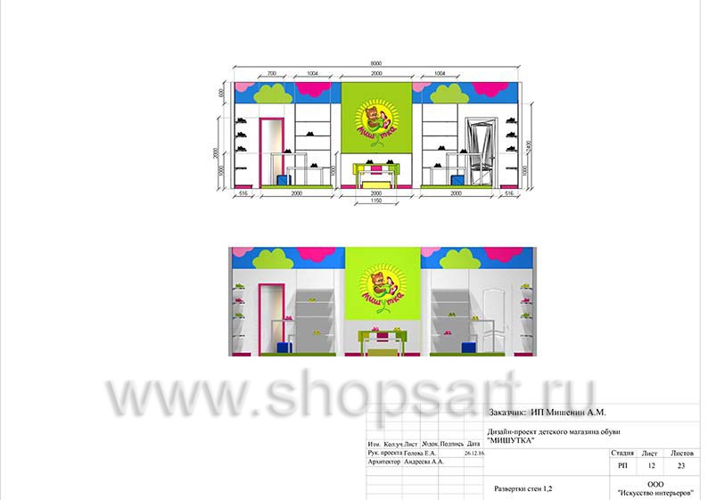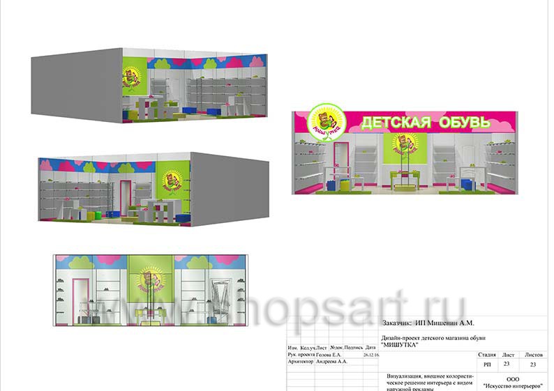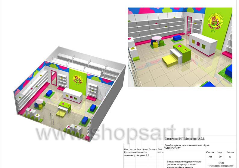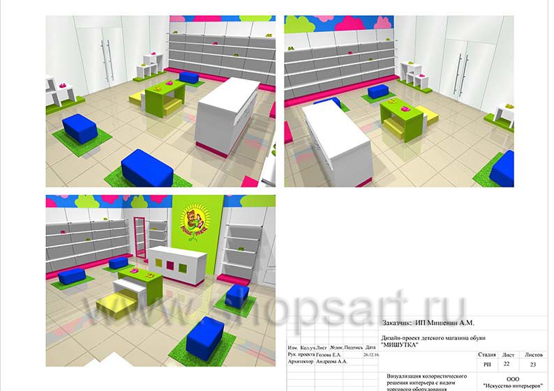 Дизайн помещения детского магазина обуви «МИШУТКА», разработан на основе выбранного стиля компании, с использованием приемов и решений, выгодно преподносящих покупателю обувь.