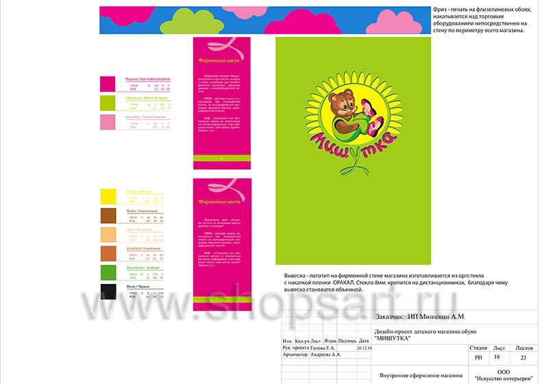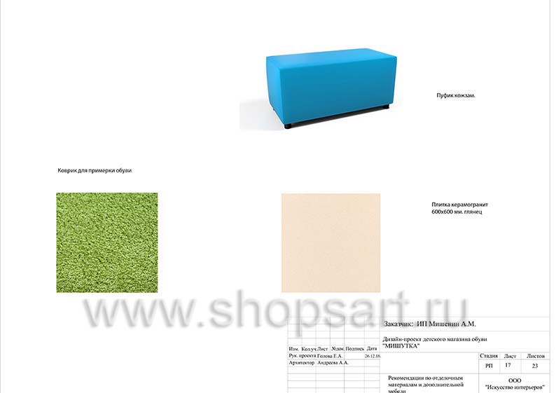 Торговое оборудование представлено в виде пристенного оборудования с белыми полками из ЛДСП для выкладки обуви, задние стенки стеллажей выполняются из белого ЛДСП, в нижней части устанавливаются подиумы из окрашенного МДФ малинового цвета, подчеркивающие выставленную вдоль стен обувь. В центральной части торгового зала устанавливаются демонстрационные островные конструкции. Вдоль пристенных стеллажей располагаются голубые пуфы, стоящие на салатовых ковриках. В дальней части магазина располагается подсобное помещение. В подсобном помещении предусмотрены складские стеллажи и стол для приемки товара. Кассовый стол устанавливается в центральной части магазина на фоне фирменной стены с логотипом. На фирменной стене, возведенной из ГКЛ и окрашенной в салатовый цвет, согласно проекту, крепится логотип из оргстекла с накаткой пленки “ОРАКАЛ”. Логотип устанавливается на дистанционных держателях, которые создают объем данному изделию. По периметру магазина, на стены, наносится декоративный фриз, выполненный из флизелиновых, моющихся обоев с рисунком. Стены окрашиваются водоэмульсионной краской белого цвета.
