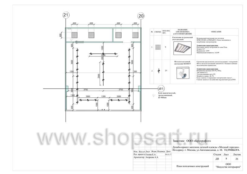 В магазине устанавливается трековая система освещения, светильники направленного света с лампами мощностью 70Вт. В подсобном помещении устанавливаются светодиодные светильники “Армстронг”.