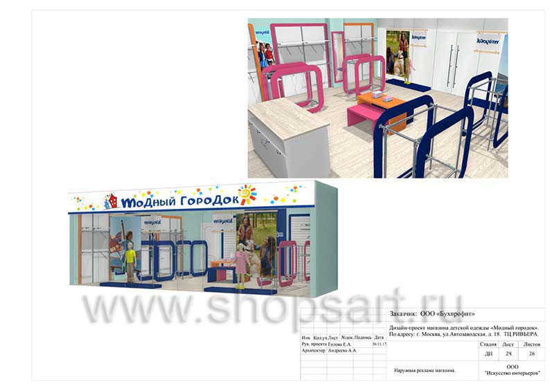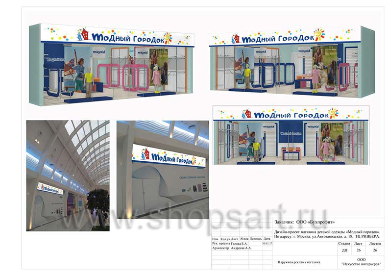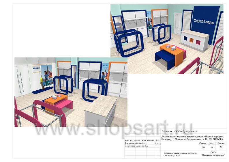 Дизайн помещения магазина детской одежды «Модный городок», разработан на основе выбранного стиля компании, с использованием приемов и решений, выгодно преподносящих покупателю модную детскую одежду.
