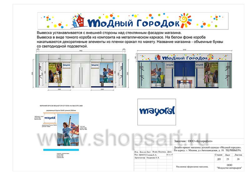 В основе дизайна заложены современные традиции, цветовая гамма, позволяющая акцентировать внимание покупателя на товаре. В магазине представлена брендовая одежда испанской торговой марки «MAYORAL». Использование логотипов и рекламных постеров не только визуально украшает интерьер, но и создает узнаваемость знаменитого бренда, представленного в магазине.