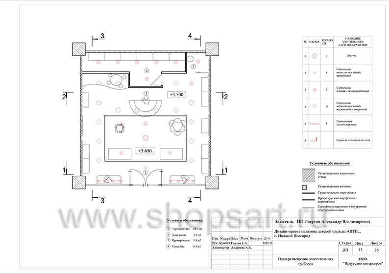 - Правильное освещение коммерческого объекта является залогом эффектной презентации товаров. Именно поэтому дизайнеры в обязательном порядке вносят схему размещения осветительных приборов в проект магазина детской одежды.
