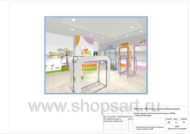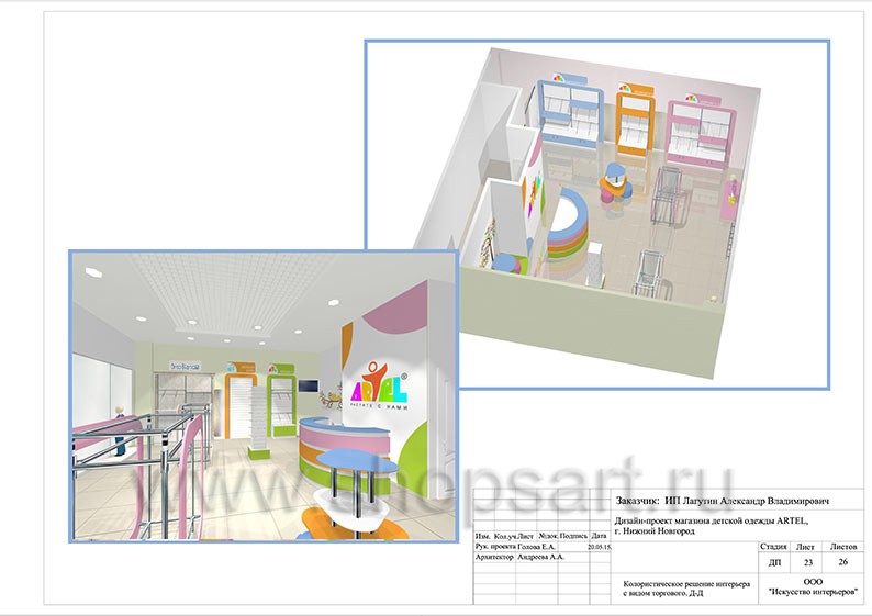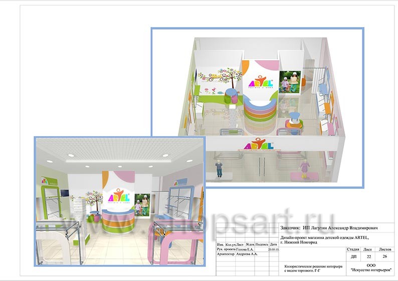 Дизайн помещения магазина детской одежды «АRTEL», находящегося в г. Нижний Новгород, разработан на основе выбранного стиля компании, с использованием приемов и решений, выгодно преподносящих покупателю детскую одежду.