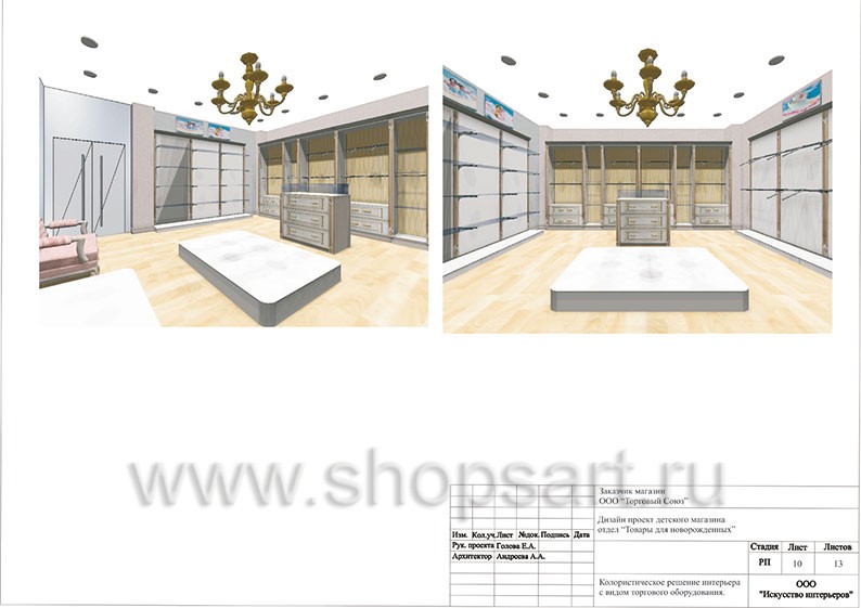 Торговое оборудование выполнено в виде пристенных стеллажей и открытых шкафов с подсветкой располагается по периметру магазина. В центральной части торгового зала устанавливаются демонстрационный стол – накопитель и подиумы для кроваток. Возле стеклянных витрин располагается подиум для кроваток и диванчик для покупателей. Цветовая гамма содержит нежно розовый и нежно голубой цвет, что подсознательно разделяет магазин на разделы одежды для девочек и одежды для мальчиков.
