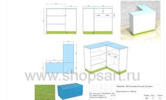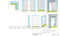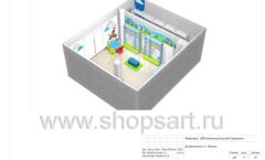 Торговое оборудование спроектировано в виде пристенных стеллажей со стеклянными полками толщиной 8мм., предназначенными для выкладки обуви. Задние стенки торговых стеллажей выполняются из белого ЛДСП, боковые стенки и нижние части подиумов изготавливаются из голубого ЛДСП, цвет которого подчеркивает представленную вдоль стен обувь. В центральной части торгового зала устанавливаются демонстрационные островные конструкции. Вдоль пристенных стеллажей располагаются удобные пуфы, стоящие на салатовых ковриках. В дальней части магазина располагается подсобное помещение. Кассовый стол устанавливается в дальней левой части магазина на фоне фирменной стены с логотипом. На фирменной стене крепится логотип.