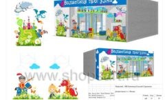 Тема оформления детского магазина – рыцарь, драконы и принцесса. Необычные рисунки, используемые в дизайне интерьера магазина, создают сказочную атмосферу для маленьких покупателей.