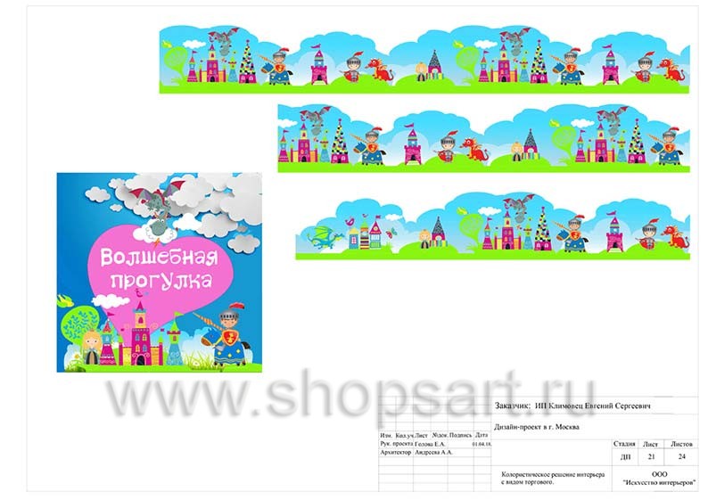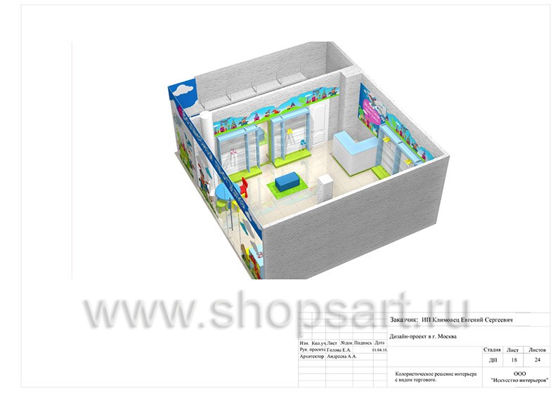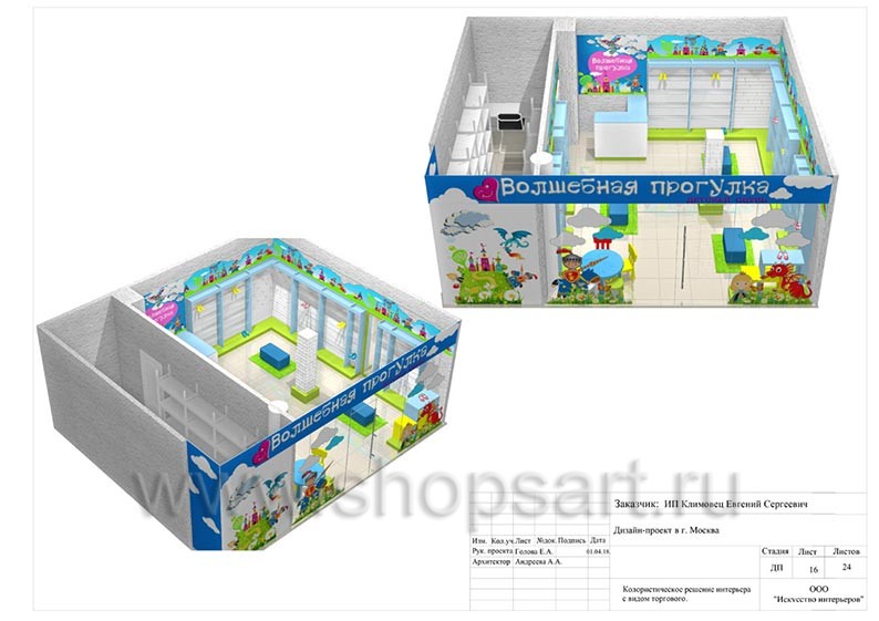 На этой странице Вы можете ознакомиться с дизайн-проектом детского магазина «ВОЛШЕБНАЯ ПРОГУЛКА», находящегося в городе Москве, Варшавское шоссе, дом 87Б, ТДЦ “Варшавский”, помещение № V, комната 2, на основе коллекции торгового оборудования «АКВАРЕЛИ». Разработала дизайн-проект магазина, дизайн интерьера и дизайн торговой мебели компания «Искусство интерьеров». Узнать больше о наших коллекциях оборудования для детских магазинов вы можете на странице мебели для магазина детских товаров .