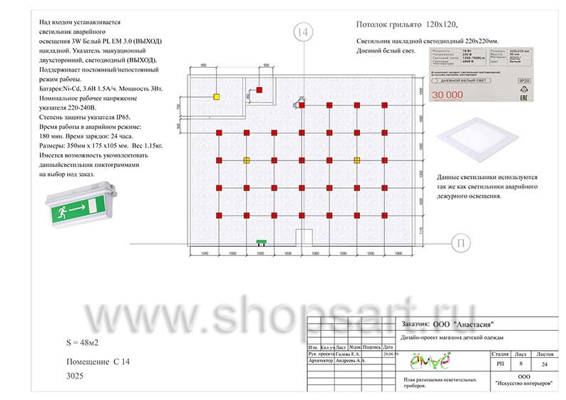 В магазине устанавливаются светодиодные светильники размером 22х22см.