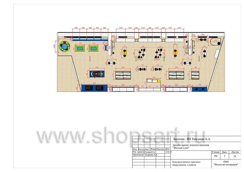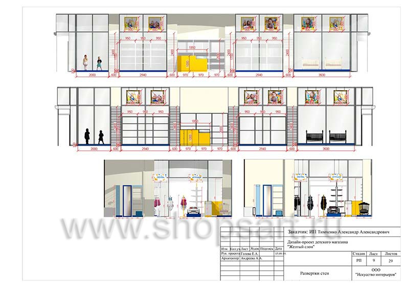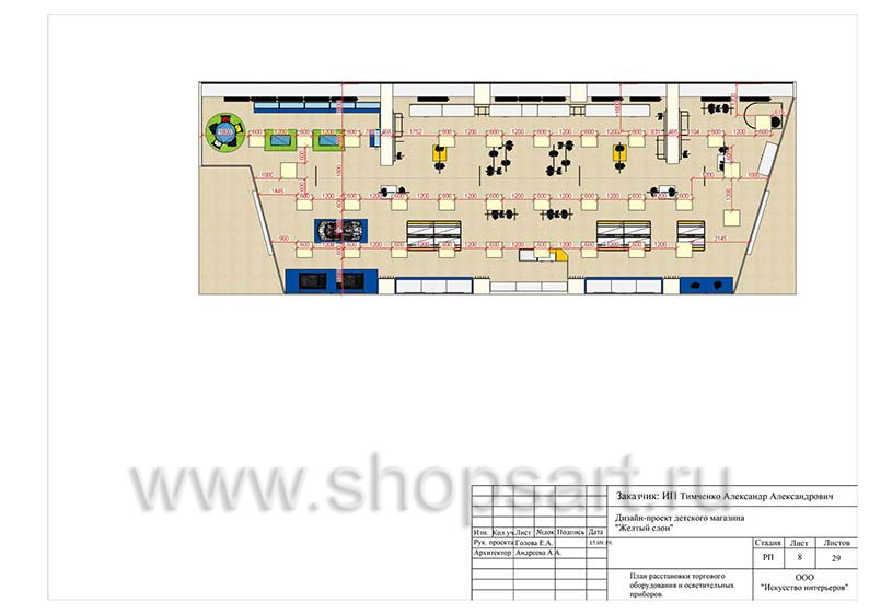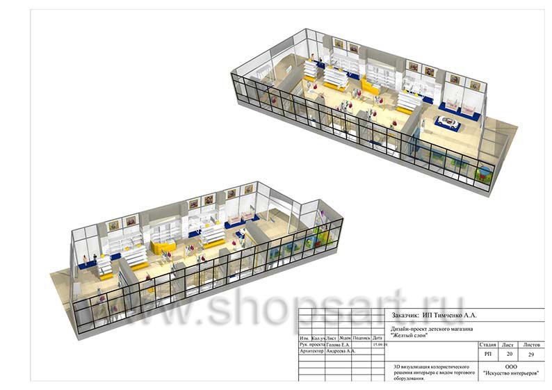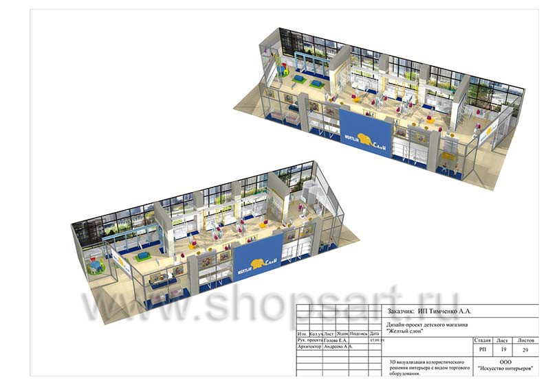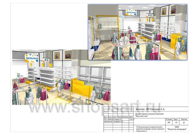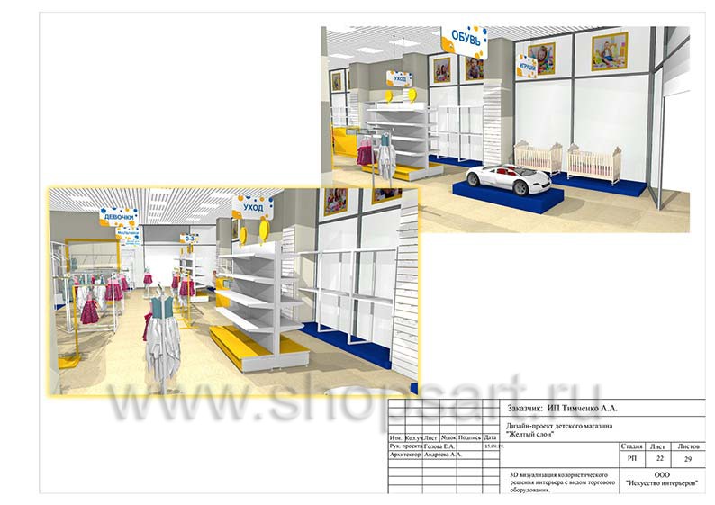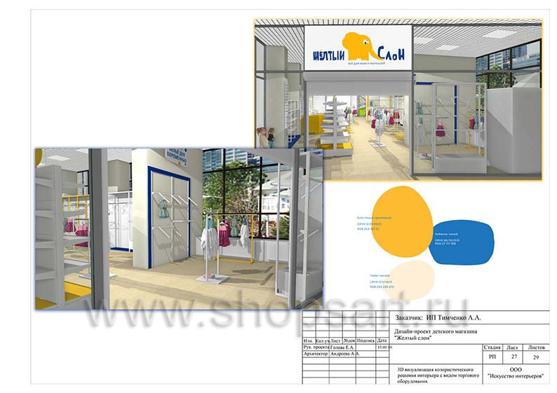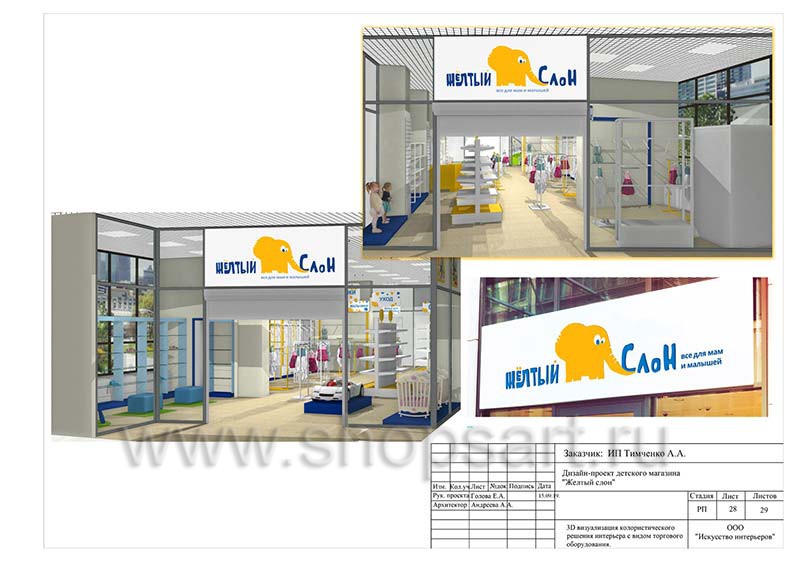 Дизайн помещения детского магазина «ЖЕЛТЫЙ СЛОН», разработан на основе выбранного стиля компании, с использованием приемов и решений, выгодно преподносящих покупателю широкий ассортимент детских товаров.