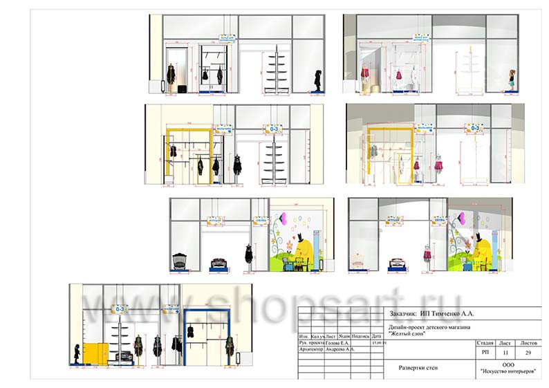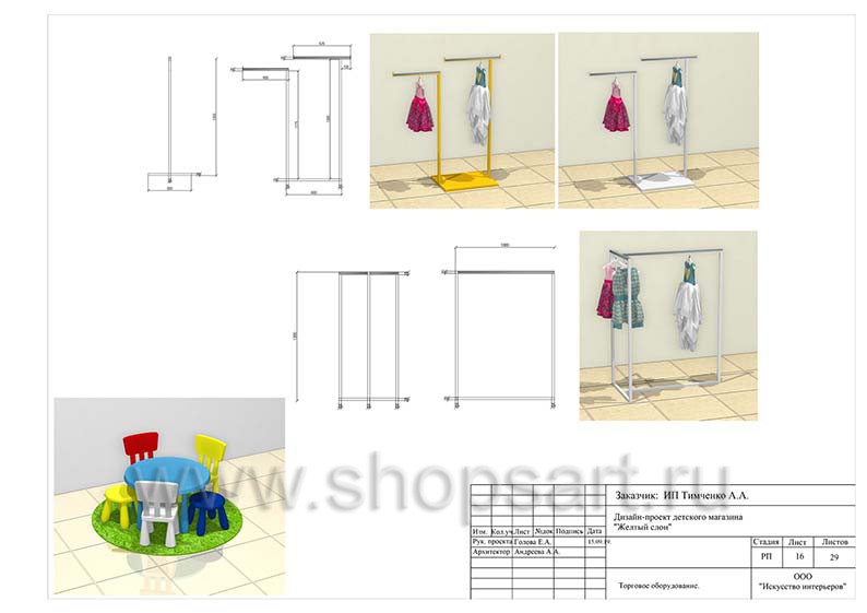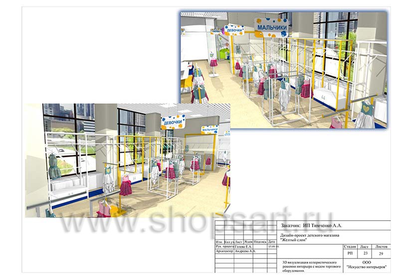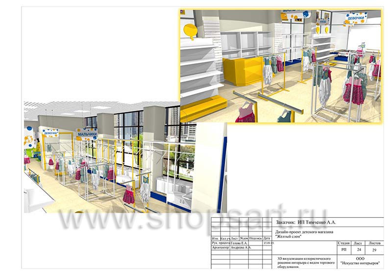 - Следующая стадия предполагает создание креативной концепции интерьера торгового объекта и зонирование территории магазина. На этом этапе специалисты разрабатывают несколько вариантов цветовых сочетаний и стилевых решений, которые предоставляются на выбор заказчику. Также они выбирают подходящую торговую мебель. Проект магазина детской одежды бывает: как бюджетным (для предоставления в торговый центр), так и расширенным (как правило создается для магазинов большой площади с большим количеством и разнообразием продаваемой продукции).