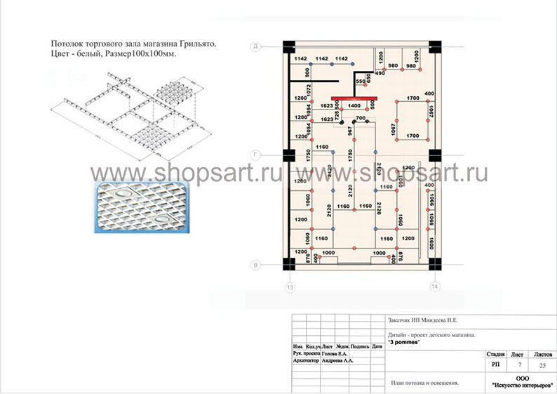 3. Потолок в торговом зале – Грильято. На потолке устанавливаются светодиодные светильники направленного свечения в сочетании со светильниками общего фона.