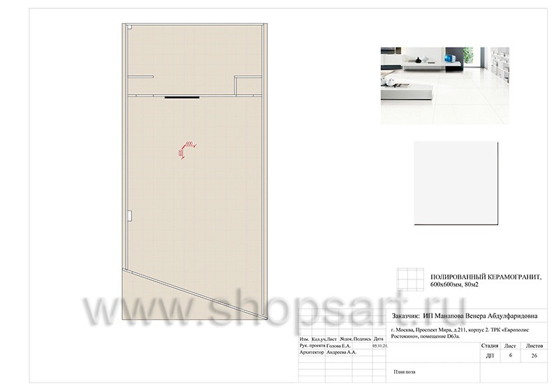 1. Напольное покрытие — керамогранит 600х600мм. – остаётся существующий.