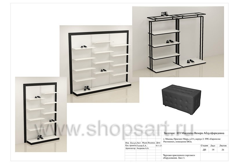 Торговое оборудование выполнено в виде пристенного оборудования с полками из ЛДСП для обуви, подчеркивают представленный вдоль стен товар. В центральной части торгового зала устанавливаются демонстрационные островные конструкции. Вдоль пристенных стеллажей располагаются удобные пуфы, стоящие на ковриках. В дальней части магазина располагается помещение для подготовки товара. Кассовый стол устанавливается в центральной части магазина на фоне фирменной стены с логотипом. На фирменной стене крепится логотип.