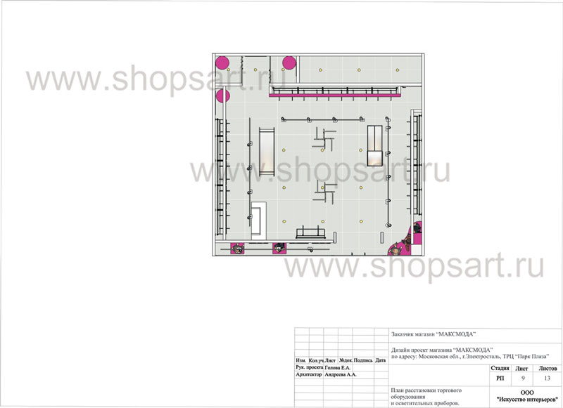 - Правильно подобрать систему освещения, чтобы в помещении было не слишком тускло или, напротив, не излишне ярко. Профессиональный дизайн магазина одежды непременно включает в себя схему размещения осветительных устройств.