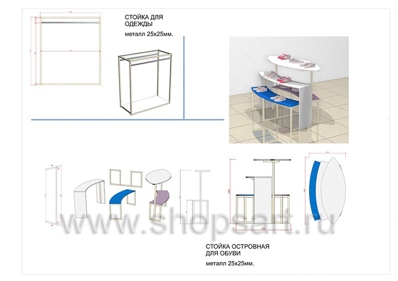 Торговое оборудование выполнено в виде пристенных торговых стеллажей из металла бежевого цвета. Металлические стойки, крепящиеся к стене или самостоятельно стоящие, имеют разнообразные кронштейны для выкладки или навески детской одежды и полки с накопителями для демонстрации обуви. В центральной части торгового зала устанавливаются демонстрационные островные конструкции.