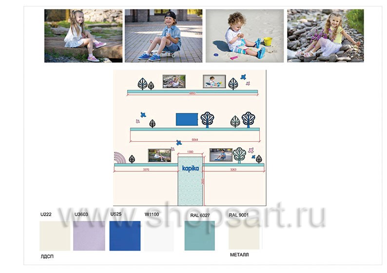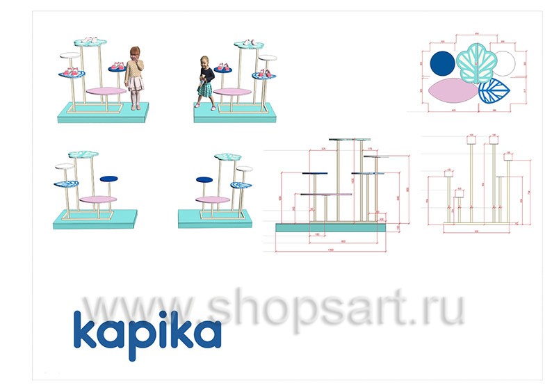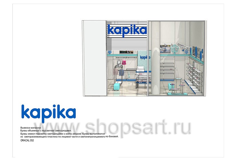 Дизайн помещения детского магазина «Kapika», находящегося в ТРЦ “VEER Moll”, город Екатеринбург, проспект Космонавтов, дом 108, разработан на основе выбранного стиля компании, с использованием приемов и решений, выгодно преподносящих покупателю модную детскую обувь и одежду.