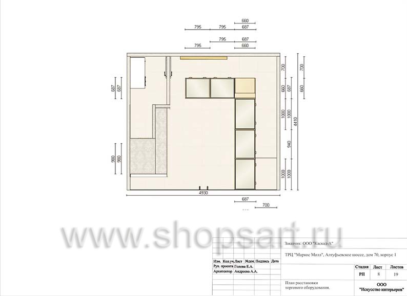 Торговая мебель в виде линии прилавков расположена по периметру магазина. В центральной части, напротив входа устанавливается фирменная стена с логотипом. В левой части, по бокам стоят стеклянные витрины. В глубине магазина, за прилавками, располагается дверь в подсобное помещение, в котором устанавливается сейфовый шкаф. Касса расположена в линии прилавков.