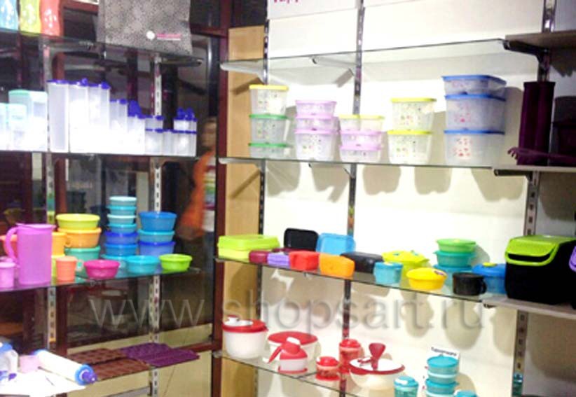 Образец правильного оснащения представлен на данной странице нашего сайта. Это фото торгового оборудования магазина посуды Tupperware. Только посмотрите, насколько функциональны использованные для данного объекта конструкции! Они смотрятся гармонично и никак не загромождают пространство коммерческого помещения. Такое интерьерное решение не только привлечет покупателей. Мебель отличается прочностью и устойчивостью к весовым нагрузкам, что является важным фактором, когда речь идет об оснащении магазина посуды. Данные качества также обеспечат длительную эксплуатацию торговых конструкций. Лаконичный дизайн оборудования выполнен в духе интерьерных тенденций, актуальных в разные времена.