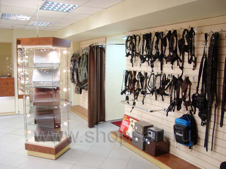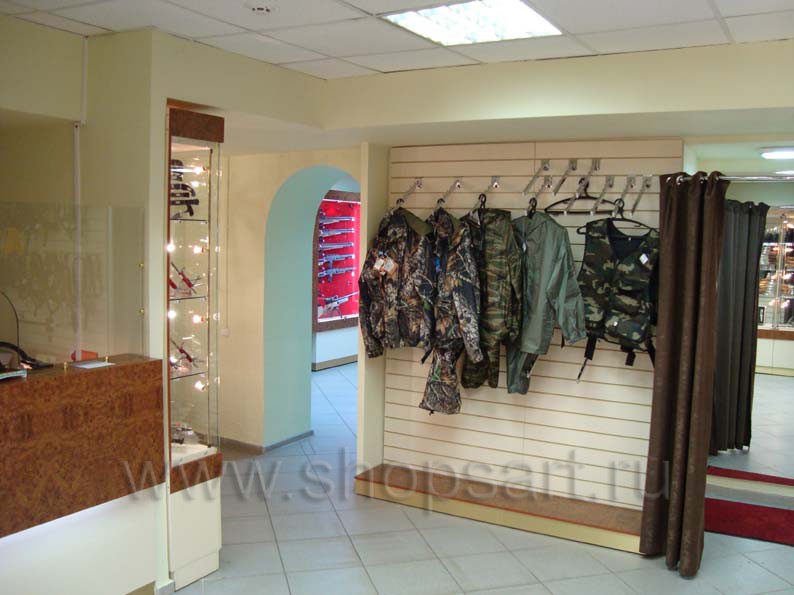 - Торговое оборудование коллекции ОХОТА И РЫБАЛКА зал одежды для оружейного салона На Люсиновской. Фото 01.