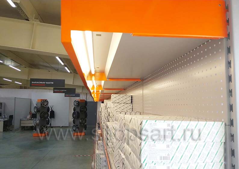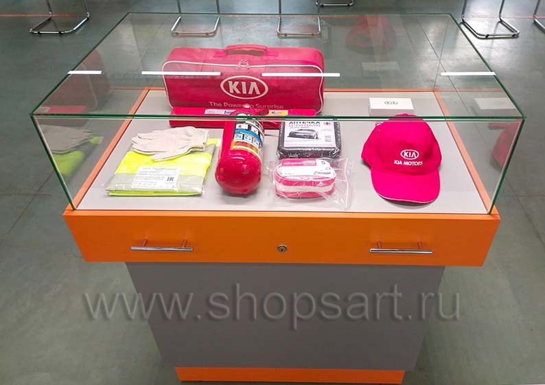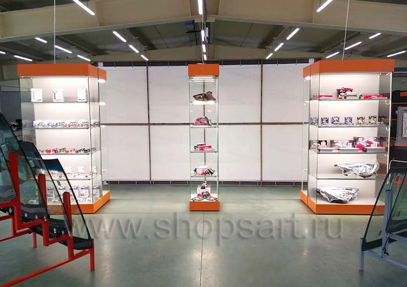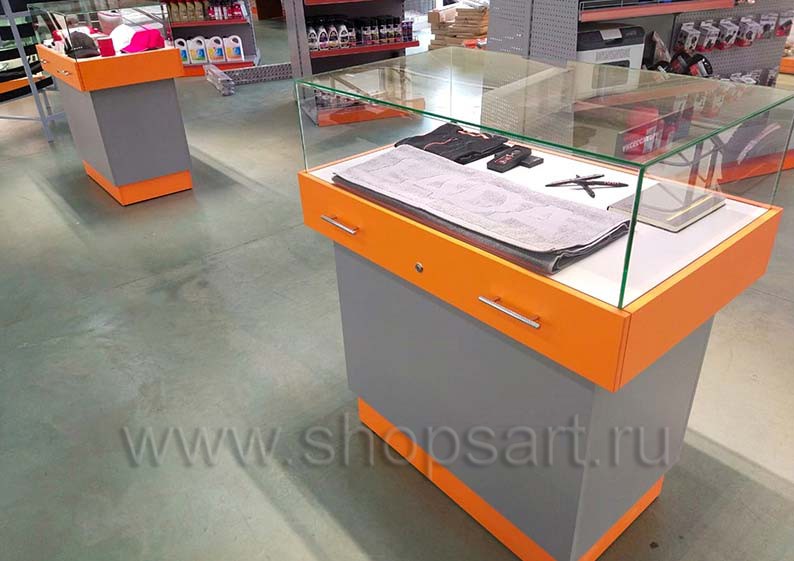 Для размещения запчастей маленьких размеров удобно использовать витрины. Конструкции данного типа акцентируют внимание посетителей к мелким автотоварам и обеспечивают оптимальный обзор такой продукции благодаря своей прозрачности. Витрина в автосалон является отличным решением и с точки зрения безопасности. Дело в том, что использование такой конструкции позволяет обеспечить сохранность продукции. Размещенный на таком оборудовании товар затруднительно украсть. Часто в стеклянных витринах размещают дорогие запчасти.