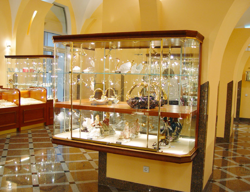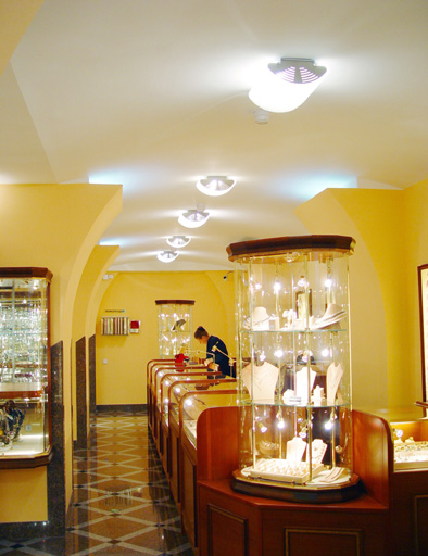 Дизайн интерьера ювелирного магазина “Октябрь”, г. Москва, Фрунзенская набережная, на основе коллекции торгового оборудования «КОРИЧНЕВАЯ КЛАССИКА»